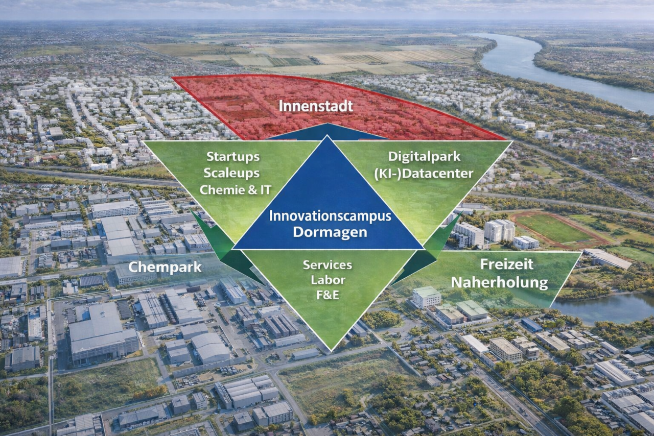 Die Stadt Dormagen im Rhein-Kreis Neuss, zentral gelegen zwischen Köln und Düsseldorf, gestaltet den Strukturwandel im Rheinischen Revier aktiv mit. Mit dem innovativen Projekt „Innovationscampus Dormagen“ entsteht auf rund 27,8 Hektar eine hochmoderne Entwicklungsfläche, die neue Maßstäbe für Wirtschaft, Innovation und Digitalisierung setzt. Das Areal liegt strategisch günstig zwischen der Innenstadt Dormagen und dem CHEMPARK Dormagen – einem der bedeutendsten Industriestandorte in der Region.