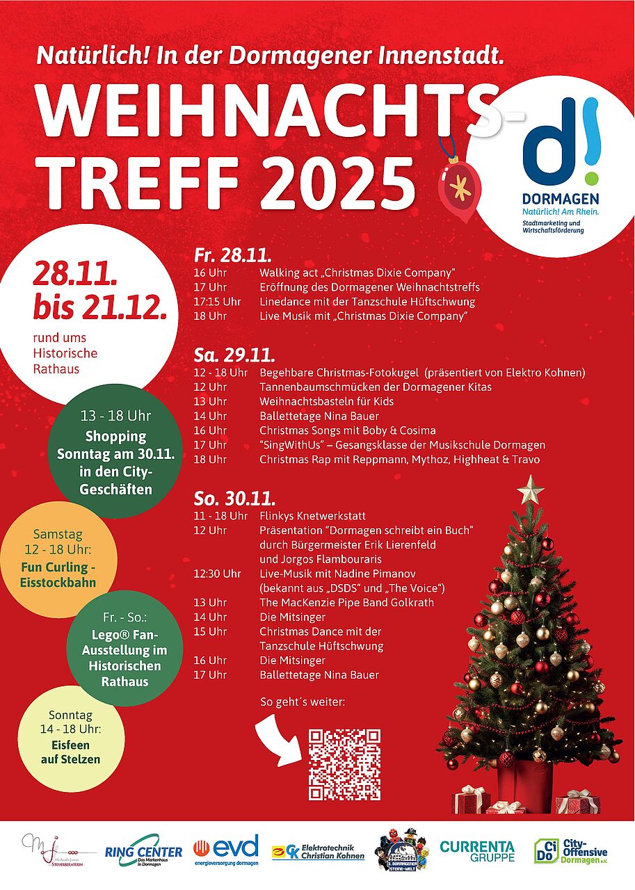 Zusätzlich zu einem bunten Bühnenprogramm erwarten die Besucherinnen und Besucher am Samstag, 29. November, eine begehbare Christmas-Fotokugel, das beliebte Eisstockschießen auf dem Platz hinter der Cafeserie Lemke sowie das traditionelle Tannenbaumschmücken der Dormagener Kitas.